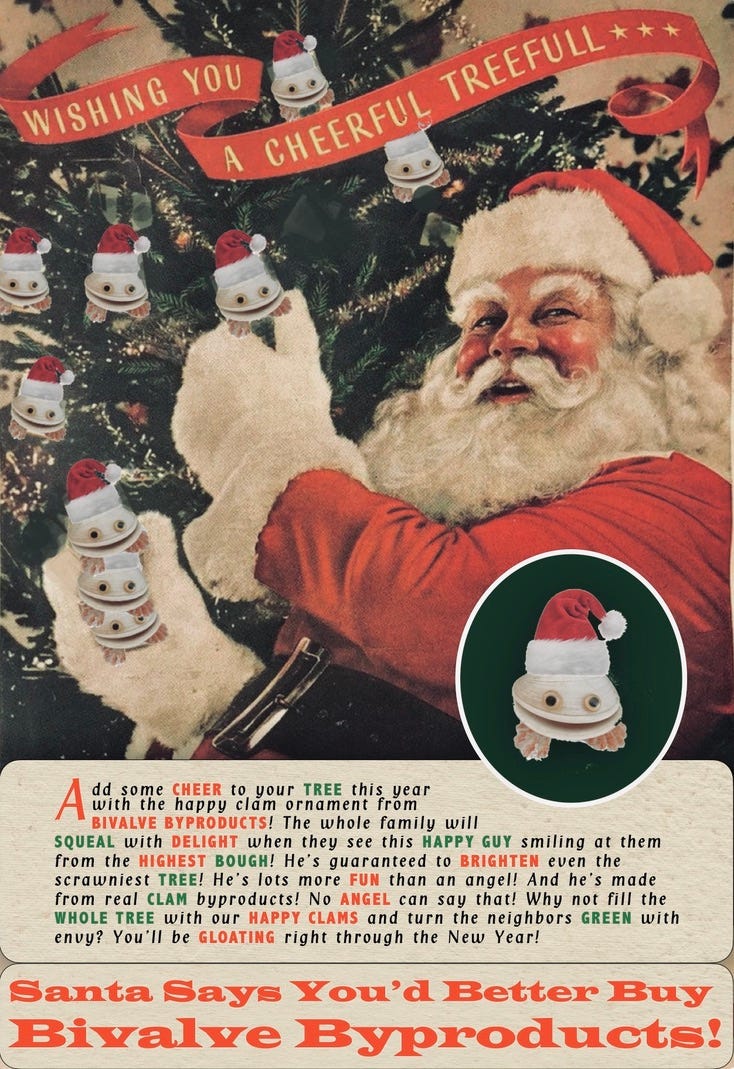 Mr. Bud may have been “a genius of sorts,” but he may also have been a plagiarist. As “a genius of sorts,” he was the designer of the Happy Santa Clam Christmas Tree Ornament, apparently an original idea of his own. However, as a plagiarist he may have been behind the advertisement for the Happy Santa Clam Christmas Tree Ornament, which brought a sharp rebuke, a cease-and-desist order, and a lawsuit from the Liggett & Myers Tobacco Company. Here is the advertisement for the Happy Santa Clam Christmas Tree Ornament: