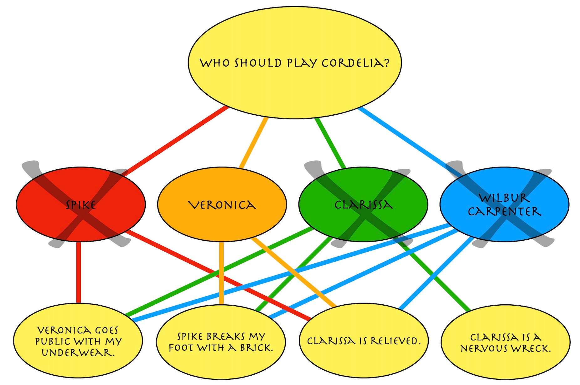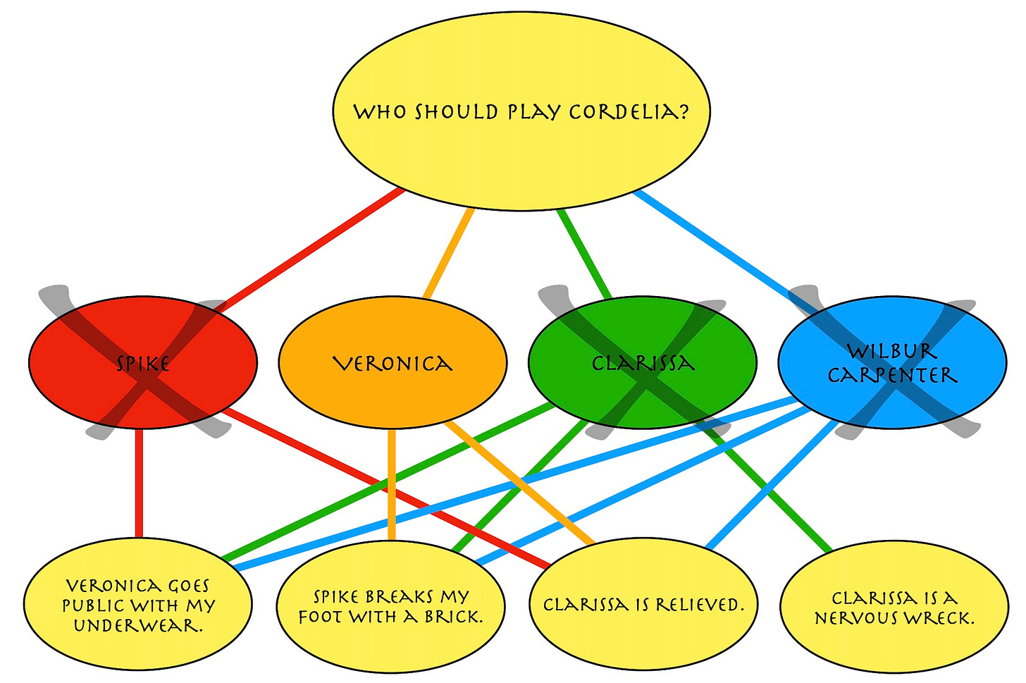 I WOKE EARLY on Sunday morning and sat upright in my bed thinking the situation over. My two biggest problems were Spike and Veronica. Until I chose one of them to play the part of Cordelia, I wasn’t going to be able to think about the other roles. Thank goodness I didn’t have to worry about Clarissa, too. … I decided to give the part to Veronica.