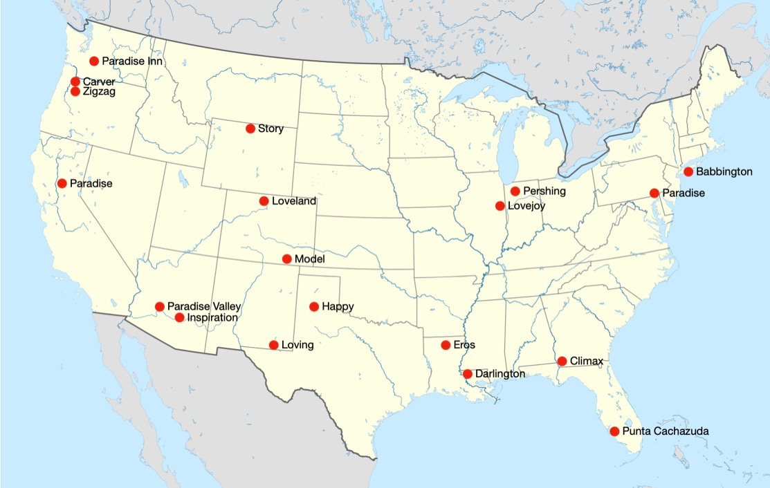 They followed a zigzag route that took them through a number of small towns that Lorna chose for their names: Candor, New York; Freedom, Independence, and Paradise, Pennsylvania; Leroy and Huber Heights, Ohio; Pershing, Indiana; Piper City and Lovejoy, Illinois; Baring, Amoret, and Peculiar, Missouri; Hope and Paradise, Kansas; Ovid, Loveland, and Model, Colorado; Story and Paradise Valley, Wyoming; Epiphany and Eureka, South Dakota; Twin Bridges and Paradise, Montana; Bliss and Deary, Idaho; Opportunity and Paradise Inn, Washington; Zigzag, Carver, and Sisters, Oregon; Fortuna, Enterprise, Commerce, and Paradise, California; Inspiration and Paradise Valley, Arizona; Loving, New Mexico; Happy and Goodnight, Texas; Plain Dealing, Eros, and Darlington, Louisiana; Castleberry, Alabama; Climax, Georgia; and, finally, Punta Cachazuda, Florida.